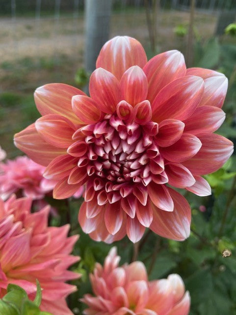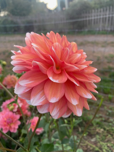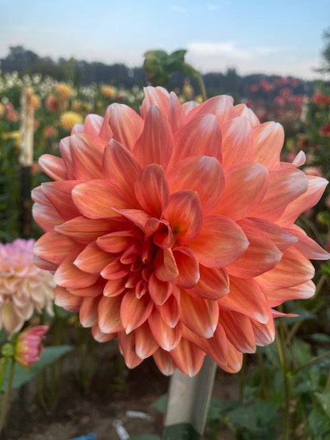 Dark apricot 5" bloom with white tips, rounded petals, 4' plant