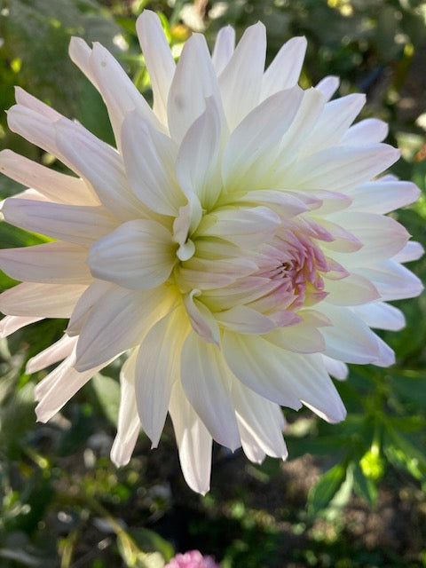 Unusually pretty pure white 5" bloom, semicactus with fibriated tips, pale lavender and butter yellow traces in center, tall 5.5' plant.
