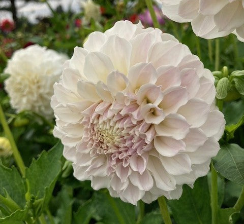Lacy 4" bloom with a blush tinge in cooler weather. 4.5' plants. Our new pick for a white. Looks soft and fragile, but holds up well in the vase and on the plant