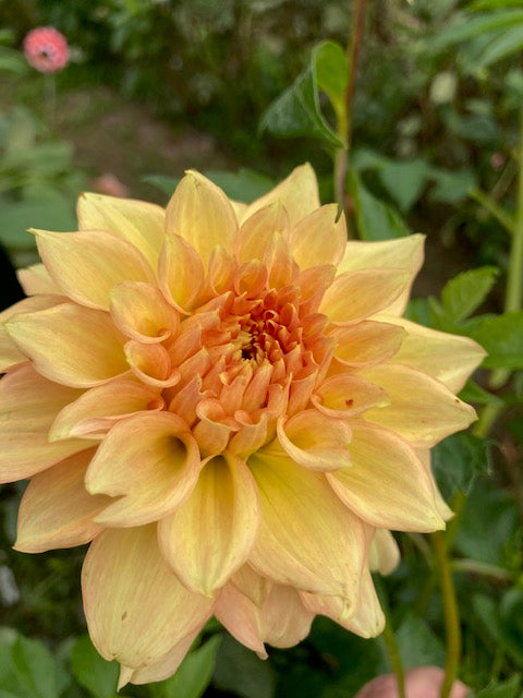 5" blooms are mostly pale yellow, with darker apricot centers and pale apricot fade on edges, 3.5' plant, prolific