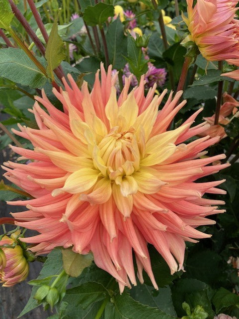 5-6" incurved cactus with tomato red petals, yellow center petals, a splendid focal dahlia. Tall plant