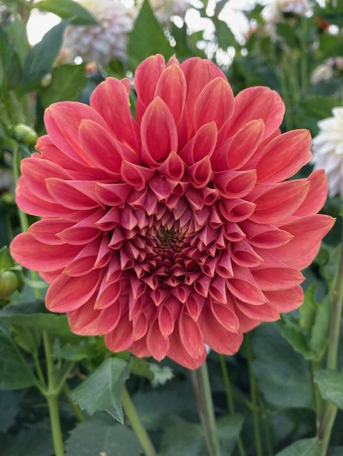 4" textured bloom on very strong stems, petals reflex to stem, making a strong ball shape. 5' plant