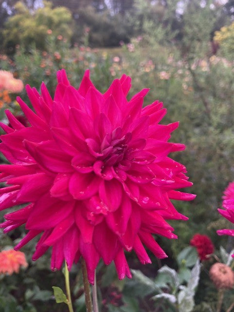 Bright! magenta semicactus, lots of 4" blooms, petals come to a point creating a star effect, 6' plant