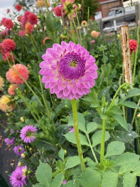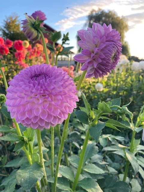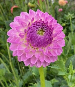 Little 3" lavender ombre ball, petal tips and backs are darker, prolific.
